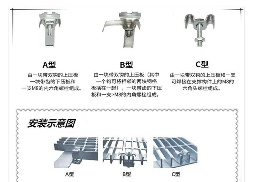 鋼格板安裝夾是用優質鋼板經過機器折彎,打孔之后做成的,安裝夾結實耐用,安裝簡便,鍍鋅后的安裝夾美觀牢固,且不易生銹,能夠很好的固定鋼格板。